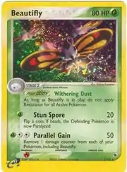 Beautifly (Japanese: アゲハント Agehunt) is a Grass-type Stage 2 Pokémon card. It is part of the EX Ruby & Sapphire expansion.