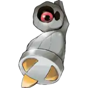 Beldum is a robotic Pokémon that has a long body with a set of claws sticking out of its rear end. It has one large, red eye in the center of its nearly spherical head, which is set into a ball-and-socket joint at its front end. A short crest projects from its body and extends over its head.