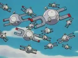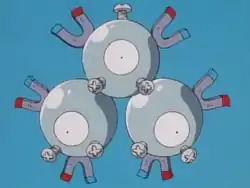 Later, after Ethan is hurt by Team Rocket, Ash is tasked with bringing the Magnemite to the next town. However, none of the Magnemite obey Ash and wander off. Pikachu manages to do Jolteon's job and brings all the Magnemite back, except Number 6. Ash finds it near a stream but Team Rocket are also there. They use static electricity to pull all of the Magnemite, including Number 6, which Ash is still holding onto. Pikachu attempts to corral the Magnemite back from Team Rocket, but the power of the static is too great. Seeing how hard Pikachu is fighting for the Magnemite, Number 6 collides with Team Rocket's electric ray and Pikachu's Thunderbolt absorbing both and freeing its fellow Magnemite. Suddenly it evolves into a Magneton and sends Team Rocket blasting off. Number 6's known moves are Thunder Shock and Thunderbolt. | ||