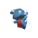 Gabite is a medium-sized, bipedal, dragon-like Pokémon that is primarily blue. Its underside is light blue, with red covering it from the middle of its abdomen to the bottoms of its jaw. Gabite has two appendages that resemble jets or plane engines extending out the side of its skull. Each appendage has a blue stripe. It has four fins, one on each arm, one on its back, and another on its tail. The back fin has a notch on it for the male. It has spikes on its hind limbs, and sharp claws on its feet. Its eyes have black sclerae and gold colored irises.