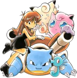 - An artwork of an unnamed female character drawn by Ken Sugimori was released in Pokémon Red and Green's official strategy guide, released in April 1996.[2] This artwork also appears on the cover a revised version of the guidebook that includes the Japanese Pokémon Blue as well.[3]
