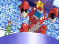| Kyle used Crawdaunt in the semifinals against Dawn and her Piplup. When Piplup launched a Whirlpool, Crawdaunt was able take control of the water by using Surf and Dark Pulse. Kyle then called for Crawdaunt to use Crabhammer, but Piplup had been using a spinning Bide to absorb the previous Dark Pulse attack. When Crawdaunt got close to use Crabhammer, Piplup unleashed the Bide energy and knocked out its opponent, putting Dawn through to the finals.
