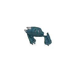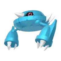 Metang is a robotic Pokémon with teal, metallic skin. It has a disc-shaped body with a pair of flat, gray spikes on either side toward the rear. A jet cannot scratch Metang due to its strong body. There is a gray spike in the middle of its face, similar to a nose. A pair of red eyes reside in two holes in its metallic skin. While it appears to lack legs, it has a pair of thick arms with three claws on the ends. The arms are considerably thicker below the elbow and have a flat, blunt protrusion extending over the joint.