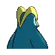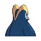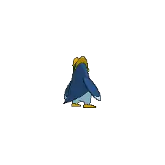 Prinplup is a blue, penguin-like Pokémon. It is mostly dark blue with light blue facial markings, wing tips, and lower body. Its eyes are blue and it has a short yellow beak with a small point above it. Two large, yellow ridges extend from its beak over the back of its head and meet just above the nape of its neck. On its body are four large, white spots that resemble buttons. Instead of arms, it has long, flipper-like wings that are capable of knocking over and snapping trees. It has short legs with yellow, three-toed feet. Prinplup has a high sense of self-pride, which prevents it from forming groups of its own kind. This Pokémon can be found in icy waters, where it hunts for prey.