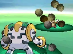 Groudon swings one of its arms and smashes a nearby rock structure. The rocks then fall down onto the opponent, or Groudon waves one of its arms and a barrage of large boulders comes out of it and onto the opponent. | ||