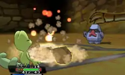 | Meditite points at the ground, causing a large pile of stones to shoot up from the ground at the opponent. | |||