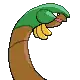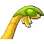 Tropius is a large, sauropod-like Pokémon with a brown body wrapped in green leaves on its chest and head. It possesses large, broad green leaves on its back, which it uses for flight and for sugar production via photosynthesis. Despite being very big and bulky, it is surprisingly maneuverable in the air. It has a long neck with a thin black line around it. It uses its neck for reaching treetops to gorge on its most favored fruit. Since it ate only this kind of fruit continuously, the fruit began to grow around its neck. These yellow, banana-like fruits can be picked and consumed by other Pokémon or humans, and grow twice a year because of the rapid production of sugar in Tropius's leaves. Its feet have toenails the same color as its fruit.