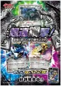 Another special pack available from July 18, 2015 was the Hoopa's Appearance~! Album Set (Japanese: 映画公開記念<劇場・ポケモンセンター限定> 「フーパのおでまし~!アルバムセット」 Movie Commemoration <Theater•Pokémon Center Limited> Hoopa's Appearance~! Album Set), which comes with two Legendary Shine Collection Concept Packs, released on the same day, and an album for displaying up to 12 cards. Two pages in the album feature large illustrations that can be completed by inserting the appropriate cards. The first page contains an illustration by Naoki Saito, which features an arid landscape and Dahara City in the distance, and includes space for the promotional Hoopa card available to movie patrons. The second page contains a landscape illustration by Shin Nagasawa and includes spaces for Regigigas, Arceus, and White Kyurem, all from the Legendary Shine Collection. Although the last two pages contain no large illustration, the display flaps on the third page have the edges of Reshiram and Black Kyurem, which form a collective image by Mitsuhiro Arita.