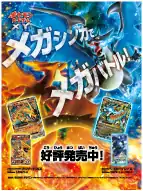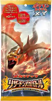 As part of a collective campaign leading up to the beginning of the Lizardon Mega Battle beginning in May 2014, a special commemorative pack was released on April 19, 2014. The Lizardon Mega Battle Mega Pack (Japanese: メガパック 「リザードンメガバトル」) is presented in the same foil packaging as booster packs, though is considerably larger, and contains a double-sided B2 poster, 6 booster packs, and 1 of 3 random promotional cards. The poster features the Flame Pokémon Charizard on one side and a Wild Blaze card gallery on the other. The 6 booster packs comprise 2 from Collection X, 2 from Collection Y, and 2 from Wild Blaze. The 3 promotional cards available include Chespin, Fennekin, and Froakie, all of which had previously featured English-exclusive artwork.