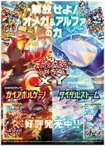 Continuing with trends established the previous year, the campaign leading up to the start of the Rayquaza Mega Battle in May 2015 saw the release of another large booster pack-style item of merchandise. Released on April 17, 2015 was the Rayquaza Mega Battle Mega Pack (Japanese: メガパック 「レックウザメガバトル」), which comes packaged with a double-sided B2 poster, six booster packs, and one promotional Blaziken-EX card. The selection of booster packs include two from Gaia Volcano, two from Tidal Storm, and two from Emerald Break; the poster features artwork promoting the Rayquaza Mega Battle on one side and an Emerald Break card gallery on the other.