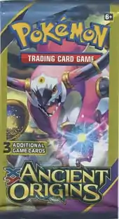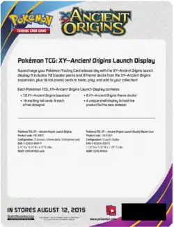The 3-card Mini Packs for the Ancient Origins expansion, sold exclusively at Dollar Tree stores, were available midway through October 2015. For only one dollar, the packs contained one Common, one Uncommon, and any other one card from the Ancient Origins expansion, along with a promotional advertisement. These promotional advertisement featured the Ancient Origins expansion on one side, with the other side promoting one of four things: Play! Pokémon, Pokémon TV, Pokémon.com, or the Pokémon anime. The packs for this expansion featured a redesigned front, with text shifted around the front of the packaging.