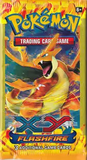 The Flashfire expansion featured its own set of Blister Packs set released alongside the expansion on May 7, 2014. Four different Blister Packs were available: 2 Three Pack Blisters and 2 single Pack Checklane Blisters. The Three Pack Blisters, available in North America for the first time since Boundaries Crossed, featured the original cardboard packaging in favor over the plastic packaging first utilized halfway through the release of the Emerging Powers Blisters. As the name suggests, three Flashfire booster packs were available in each Blister, along with a coin and either a promotional Plasma Blast Haxorus or a promotional Plasma Blast Machamp. The Single Pack Blisters featured 1 Flashfire pack, 1 coin, and either a Skiddo or Honedge Cosmos Holofoil XY Black Star Promotional card. The coins in these four Blisters were primarily large-sized, Silver Cracked Ice Holofoil, Black-backed Xerneas or Yveltal Coins, though some included repackaged coins from earlier Theme Decks.
