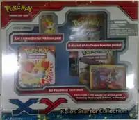 Available starting in December 2013 were the Kalos Starter Collections. These collections were yet another option available to those looking for the Kalos Starter Set. Included in each Kalos Starter Collection is the 60 card Chespin Deck, Fennekin Deck, or Froakie Deck, a card checklist for the Kalos Starter Set, a coin featuring one of the three Kalos starter Pokémon, a 2-player playmat and rulesheet, 2 Black & White Series booster packs, a code card that unlocks the respective deck online, as well as one of the three Collector's Pins available in the Collector's Pin Three Pack Blisters. However, this variation of the Kalos Starter Set merchandise only has each Stage 2 Pokémon as a Sheen Holofoil card, instead of the entire evolutionary family of the Kalos starter Pokémon.