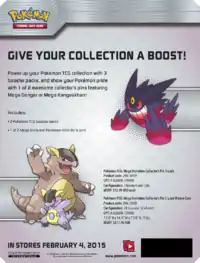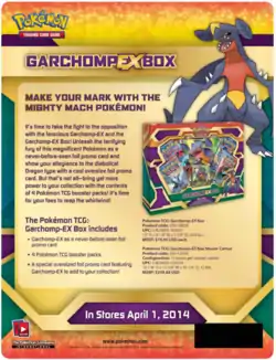 Released April 1, 2014 was the Garchomp-EX Box. This promotional box contained the promotional Garchomp-EX card, as both a standard sized and Jumbo Promotional card, in additional to four booster packs: 3 from the XY expansion, and 1 from the Black & White Series.