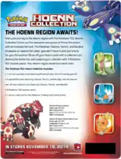The Hoenn Power Tins, featuring three different Pokémon-EX, were made available exclusively at Wal-Mart stores starting June 1, 2015, and distributed elsewhere June 17, 2015. Containing four booster packs and a code card for the TCGO, the three tins feature Sceptile, Blaziken, and Swampert, the three final starter evolutions of the Hoenn region, as Pokémon-EX cards. At the time of release, Sceptile-EX was not revealed for release in Japan, but the two others were already made available through various XY-P Promotional means. Like the last released Legends of Hoenn Tins, the code card unlocks a full 60-card deck (the code from the Sceptile-EX tin unlocks the Sceptile-EX Deck, the code from the Blaziken-EX tin unlocks the Blaziken-EX Deck, and the code from the Swampert-EX tin unlocks the Swampert-EX Deck).