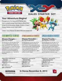 Instead of Theme Decks centered around the main expansion, the Kalos Starter Set Decks (Chespin Deck, Fennekin Deck, Froakie Deck) were released alongside the Legendary Treasures expansion instead. Featuring the three Kalos region starter Pokémon, The Kalos Starter Set Decks are a trio of Theme Decks each with a regular version and a deluxe version. Released on November 8, 2013, each deck includes damage counters, a custom coin, a rule sheet, a deckbox featuring their respective Pokémon, and a code for the Pokémon Trading Card Game Online, allowing players to unlock the deck online. The Deluxe versions also contain a booster pack from the Black & White Series.