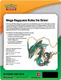 Made available starting June 17, 2015 was the Mega Rayquaza Collection. The Mega Rayquaza Collection contains an exclusive Rayquaza promotional card, a figure of Mega Rayquaza, a code card for the TCGO, and four booster packs from XY Series expansions. The promotional card is the Rayquaza from the Japanese Illust Collection. It was only available in North America, with the Rayquaza Box taking its place in Europe.
