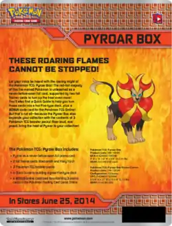 The Royal Pokémon Pyroar was the feature of June's Pyroar Box. This box, released on June 25, 2014 contains an exclusive Holofoil promotional Pyroar card, as well as 3 booster packs from the XY Series, Holofoil prints of the Flashfire Trainer cards Fiery Torch and Blacksmith, a code card for the Pokémon Trading Card Game Online, and a Quick Guide for players to utilize in making a Fire-type centric deck.