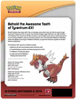 Available September 9, 2015 was the Tyrantrum-EX Box Jumbo card collection. The featured Tyrantrum-EX card was released in Japan as one of the promos for people who participated in the Pokémon Card Gym Tournaments. The box also contained a code card for the Pokémon Trading Card Game Online, and four booster packs from recent XY expansions, with an emphasis on Ancient Origins.