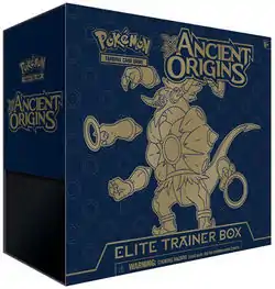 Continuing the trend of Elite Trainer Boxes, Ancient Origins brought with it the eighth installment, featuring Hoopa Unbound. Like all other Elite Trainer Boxes, it contains a stock of Energy cards, 65 card sleeves themed around the featured Pokémon, 6 damage counter dice, a coin-flip die, two acrylic Special Condition markers, a player's guide for the expansion (the Ancient Origins Player's Guide), and a collector's box.