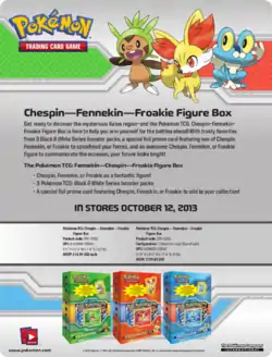In addition to the Collector's Pin Three Pack Blisters, a trio of Kalos Starter Figure Boxes made their debut on October 12, 2013. Individually named the Chespin Box, Fennekin Box, and Froakie Box, each box contained a commemorative figure and a Sheen Holofoil promotional card featuring their respective Pokémon and three Black & White Series booster packs.