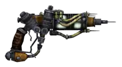 Originally developed by the Enclave for use by their ground forces, the enclave semi-automatic plasma pistol slowly spread around the east and west coasts of america following the numerous defeats suffered by the once-powerful organization. Typically only found on Brotherhood of Steel knights, Enclave remnants personnel, and weapons dealers, the weapon fetches a high price on the weapons market, and more than a few caravans are known have disappeared while carrying this valuable piece of technology. Developed separately from the Glock 86 model, this plasma pistol features five tributary energy arcs connected to a central cathode, all left without the protection of an external casing. The cathode functions much like the barrel of a gun, acting as a point of focus for the electromagnetic propeller built around it, projecting a green bolt of slow-moving plasma that carries surprisingly high levels of both thermal and kinetic energies. These high energy levels are quite powerful, capable of punching through most creatures and low-level armor.