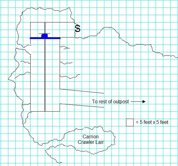 As the floor lowers it passes by a number of cracks and crevices leading out to the drop-off into the sea. Some of the crevices are quite large, in fact one is large enough for a Carrion Crawler to slip through, which is precisely what happens when the floor is about 25 feet down. Attracted by the noise the Carrion Crawler has come in search of food and immediately attacks.