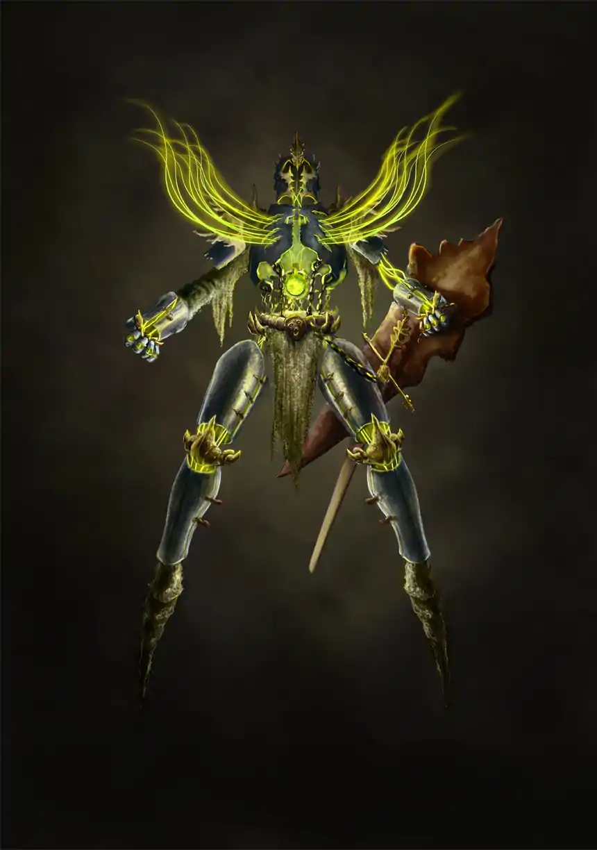 As the tireless warrior and spirit of war, Gahss is a fairly imposing figure himself, and wields complicated but otherwise broad goals and influence within the Pantheon, and even if not worshipped directly, he is respected by almost every professional warrior in the Material Sphere, and often prayers are given to him before any battle starts, and duels are announced in his name, demanding that fair, but glorious battle commence. He is invariably described as a amorphous, spiritual being, inhabiting a suit of brilliant platemail, wielding both a shield and longsword. Glory, War, and Victory are all things he takes pleasure in, though he also respects all of his opponents; He cannot take any of the former things from an unworthy opponent.