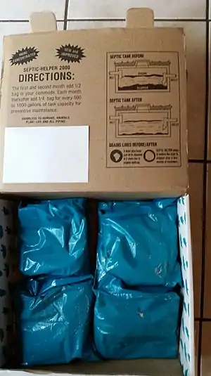 - ↑ EPA 625/R-00/008 Onsite Wastewater Treatment Systems Special Issues Fact Sheet 1 - Septic Tank Additives