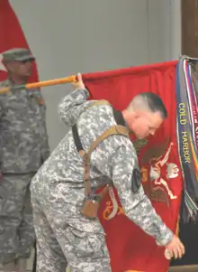 ![]() LTC Brian P. Champagne unfurling the battalion colors, Baghdad, Iraq 2010 |