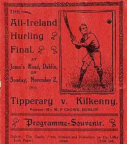 The 1913 All-Ireland Senior Hurling Championship Final was the 26th All-Ireland Final and the culmination of the 1913 All-Ireland Senior Hurling Championship, an inter-county hurling tournament for the top teams in Ireland. The match was held at Croke Park, Dublin, on 2 November 1913, between Kilkenny, represented by a club side from Mooncoin, and Tipperary, represented by club side Toomevara. The Munster champions lost to their Leinster opponents on a score line of 2–4 to 1–2.