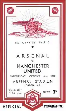 A.V. Alexander, the Minister of Defence presented Arsenal with the Shield.[13] Assessing the match the next day, Daily Express football correspondent John MacAdam wrote: "Charity begins at home, they say, and, by golly, it began at Highbury yesterday, for Arsenal were the luckiest team in the world to beat Manchester United 4–3 in the F.A. Charity Shield match between the winners of the League and the Cup."[14] The Times correspondent assessed, "Arsenal won because they sneaked a commanding lead of three goals, before Manchester had realised they were in London," and concluded the piece with the sentence "It had been a game worthy of the occasion and of two fine clubs."[13] Gate receipts for the match totalled £4,300.[14]