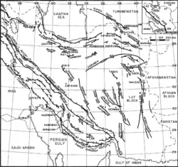The Iranian plateau is a region of highly deformed crust wedged between the Arabian Plate to the southwest and Eurasian Plate to the northeast. Crustal deformation is dictated by the 22 cm (8.7 in)/yr oblique-convergence between the two tectonic plates. Deformation is accommodated by reverse and strike-slip faulting. In northern and southern Iran, thrusting allows convergence through crustal thickening to take place. Most of the convergence is accommodated along fold and thrust belts of the Zagros, Alborz, Kopet Dag mountains, and in eastern Iran, where seismicity is high. Seismicity in the central plateau is low due to its geology consisting of rigid and aseismic tectonic blocks.[3]