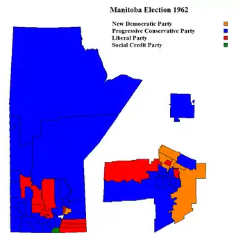 The 1962 Manitoba general election was held on December 16, 1962 to elect 57 members to the Legislative Assembly of Manitoba, Canada. It resulted in a majority victory for the incumbent Progressive Conservatives under the leadership of Premier Dufferin Roblin, securing a third term for the party.