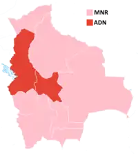 | Nationalist Democratic Action | Hugo Banzer | 493,735 | 32.83 | 41 | +17 | 10 | +4 | ||