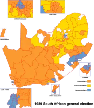 General elections were held in South Africa on 6 September 1989, the last under apartheid. Snap elections had been called early (no election was required until 1992) by the recently elected head of the National Party (NP), F. W. de Klerk, who was in the process of replacing P. W. Botha as the country's president, and his expected program of reform to include further retreat from the policy of apartheid. The creation of the Conservative Party had realigned the NP as a moderate party, now almost certain to initiate negotiations with the black opposition, with liberal opposition (the PFP) openly seeking a new constitutional settlement on liberal democratic and federalist principles.