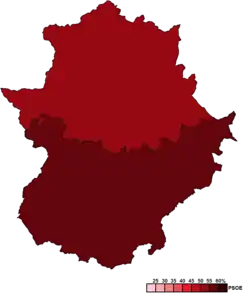 ![]() Constituency results map for the Assembly of Extremadura | ||||||||||||||||||||||||||||||||||||||||||||||||||||||||||||||||||||||||||||||||||
