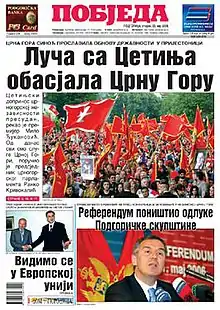An independence referendum was held in Montenegro on 21 May 2006.[1] It was approved by 55.5% of voters, narrowly passing the 55% threshold. By 23 May, preliminary referendum results were recognized by all five permanent members of the United Nations Security Council, suggesting widespread international recognition if Montenegro were to become formally independent. On 31 May, the referendum commission officially confirmed the results of the referendum, verifying that 55.5% of the population of Montenegrin voters had voted in favor of independence.[2][3] Because voters met the controversial threshold requirement of 55% approval, the referendum was incorporated into a declaration of independence during a special parliamentary session on 31 May. The Assembly of the Republic of Montenegro made a formal Declaration of Independence on Saturday 3 June.[4]