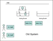 On 3 April 2006, the People's Alliance for Democracy (PAD) petitioned the Administrative Court to suspend the results of the election and accused the Election Commission of violating voter privacy. The EC repositioned voting booths so that voters' backs were to the public, whereas in previous elections, voters faced the public, with a board one-half meter tall at the front of the booth separating the voter from the public. The EC claimed the new arrangement was designed to prevent various forms of poll fraud including the use of cameras by voters to take photographs of their ballots. After the 2005 election, cameras and cameraphones had been banned from voting stations due to fears that canvassers would demand ballot photographs in return for money.[1][2][3] However, the PAD claimed that this allowed onlookers to peek over voters' shoulders and see who they voted for.[4][5]