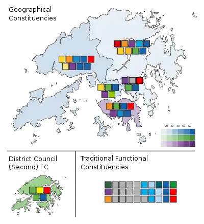 While the electoral methods in the 30 'traditional' FC seats remain unchanged, the five new seats form a new constituency called the District Council, for which candidates may be nominated by the District councillors and are elected by all registered voters who are not in any 'traditional' FC,[8] creating the largest constituency with a total of more than 3.2 million eligible electors.[9] The vote counting system used is the same as that in the GCs: the party-list proportional representation with the largest remainder method and Hare quota.