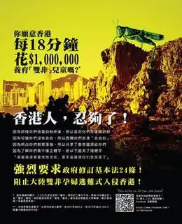 Members of the Hong Kong Golden Forum raised more than HK$100,000 to purchase a full-page advertisement in Apple Daily.[29] The advertisement was published on Wednesday 1 February 2012[30] and featured a giant locust overlooking the city skyline of Hong Kong. Locusts stereotypically represent Mainland Chinese. The ad makes the statement "Would you like to see Hong Kong spend HK$1 million every 18 minutes on the children of non-Hong Kongers? Hong Kongers have had enough! We strongly demand a stop to the unlimited infiltration of Mainland couples into Hong Kong."[29] The advertisement also employs the derogative term "double illegitimacy" (雙非),[31] which refers to residents of Hong Kong with both parents of illegal status within the territory. Protesters also argued against Hong Kong Basic Law Article 24, although Rita Fan have already said these newborns do not qualify for right of abode.[30]