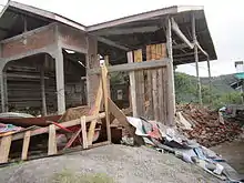 In Central Aceh, 35 deaths were reported.[4] A mosque collapse killed six children and trapped 14 others.[6] Rescuers dug through the rubble throughout the night of 2–3 July, but did not locate any of the trapped children. Numerous landslides occurred in the district and 1,368 houses were destroyed.[13][7] A further 2,135 houses suffered minor damaged.[13] On 3 July, a local official commented "People are still frightened, especially after the aftershocks last night. Nobody dared to stay at home. Everyone slept on the roads or in car parks."[7] The main hospital was overcrowded with patients, causing tents to be set up outside to handle the overflow.[7]