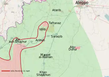 On 6 May, government forces launched an attack on the al-Alawin checkpoint and rebels positions on the hills surrounding Frikka, while the Syrian Air Force conducted more than 50 air raids in the area. Government troops (including non-Syrian militia) advanced in this area.[24][139] Meanwhile, rebels claimed to have captured the last hill near Ariha, Tal Ma'ar Tab'i,[140] while the Syrian Arab Army stated the rebel attack on the hill was repelled before nightfall.[141]