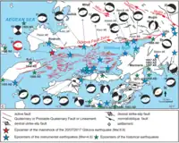 In historical times, many large earthquakes have struck the Gökova associated with the fault zone. Historical earthquakes with a record of damage include 412 BC, 227 BC, 199–198 BC, 24 BC, 141 AD, 174 AD, 344 AD, 474 AD, 554 AD, 1493 AD, 1851 AD, 1863 AD and 1869 AD events. In the 1493 event, the city of Bodrum was totally destroyed.[5] In the 20th century, large instrumentally recorded events (events recorded by seismometers or other instruments) include 1933 and 1941 with magnitudes of 6.4 and 6.0 in their respective order.[6]