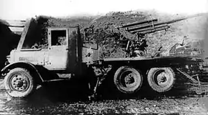 In 1934, the Design Bureau (KB) Plant No. 8 named after Kalinin received an order to install 76 mm air defense gun M1931 on the chassis of the three-axle YaG-10 truck, the production of which was completed by the Yaroslavl Automobile Plant, due to their experience with creating the SU-8. In August–September 1936, tests were carried out at the NIAP test site. The first vehicles entered service with Moscow Military District. ZSU 29-K[1] took part in the parade on Red Square in Moscow. The first display of motorized anti-aircraft guns took place at a military parade in Moscow on 1 May 1934.[2] Overall, sixty-one YaG-10 trucks were converted into 29K models. Modifications to the trucks included a reinforced undercarriage, rotating pedestal for the gun, and side boards replaced with semi-circular shields.[3]