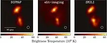 - Further observations with the Event Horizon Telescope during April 2017 provided a high level of detail to the radio jet, with a resolution as small as 20 micro-arcseconds. They indicated a bent or rotating jet shaped by shock waves.[8]