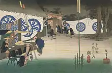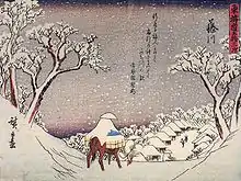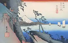 The 53 Stations of the Tōkaidō (東海道五十三次, Tōkaidō Gojūsan-tsugi) are the rest areas along the Tōkaidō, which was a coastal route that ran from Nihonbashi in Edo (modern-day Tokyo) to Sanjō Ōhashi in Kyoto.[1] There were originally 53 government post stations along the Tōkaidō, where travelers had to present traveling permits at each station if wanting to cross.