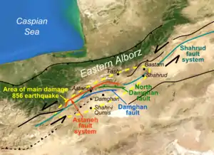 The main active structure in the Qumis region is the Shahrud fault system, which extends for several hundred km. This zone of overall sinistral strike-slip consists of several fault strands, including the Damghan Fault, Northern Damghan Fault, and the Astaneh Fault System, all of which lie within the epicentral area and show evidence of displacement during the Quaternary.[5]