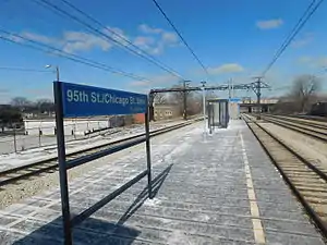 95th Street/Chicago State University is an electrified commuter rail station along Metra Electric's main line on the northeast corner of Chicago State University in Chicago, Illinois. The station is located at 95th Street and Cottage Grove Avenue, and is 12.0 miles (19.3 km) away from the northern terminus at Millennium Station.[2] In Metra's zone-based fare system, 95th Street/Chicago State University is in zone C. As of 2018, the station is the 224th busiest of Metra's 236 non-downtown stations, with an average of 24 weekday boardings.[1]