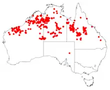 The species is found throughout the Northern Territory extending east into Queensland as far as Prairie[4] and Western Australia.[5] In Western Australia it has a scattered distribution through the Kimberley, Pilbara and northern Goldfields regions.[3] It is found on rocky plains or rocky hills, and along watercourses or damp areas. It grows well in stony soils, skeletal loams or clay pans[1][3] as part of spinifex and Eucalypt[4] communities. Localized colonies form in areas following disturbance such as fire.[1]